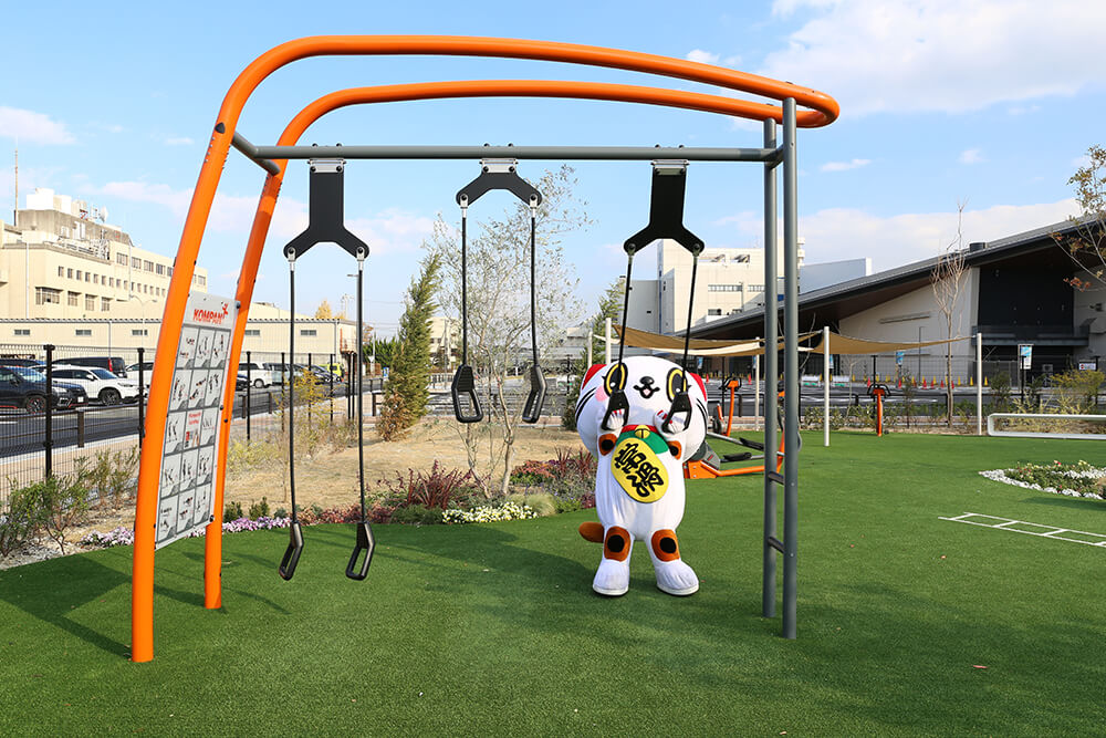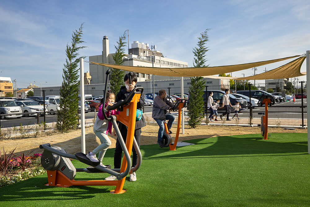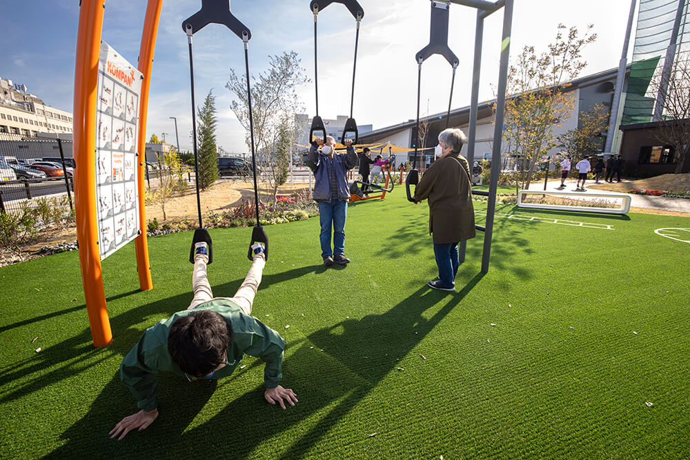デンマークの健康遊具「コンパンフィットネス」を備えた広場です。若者からシニアまで、自分に合ったペースや負荷で自由にトレーニングできます。