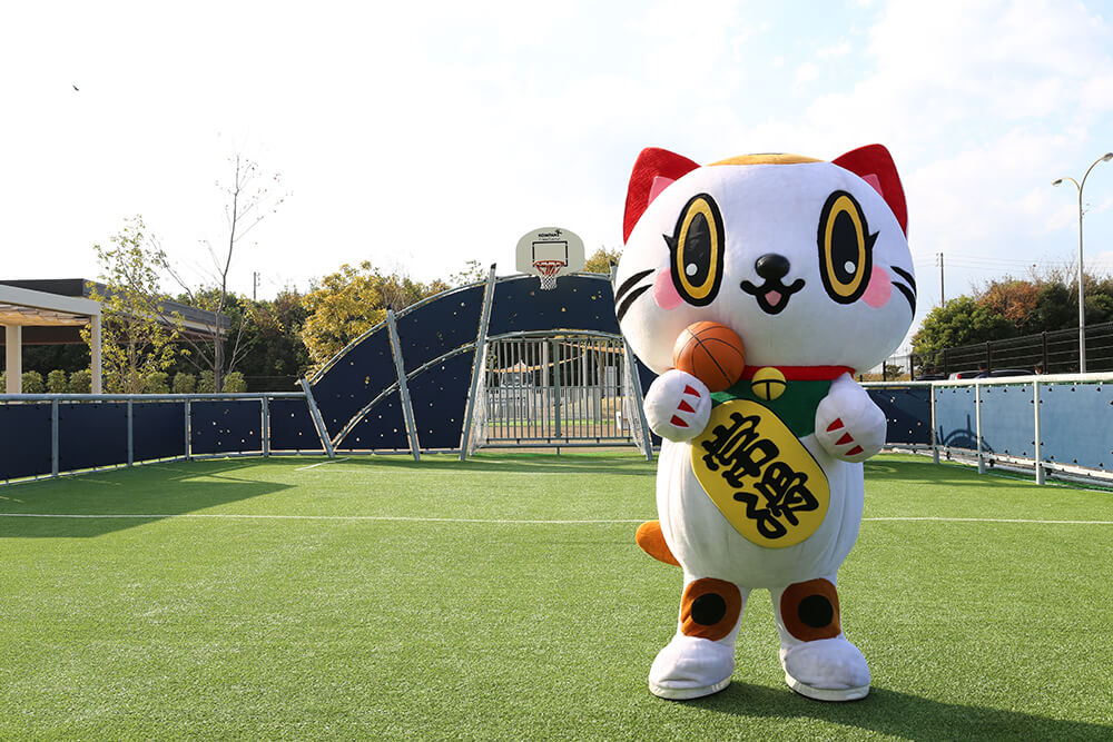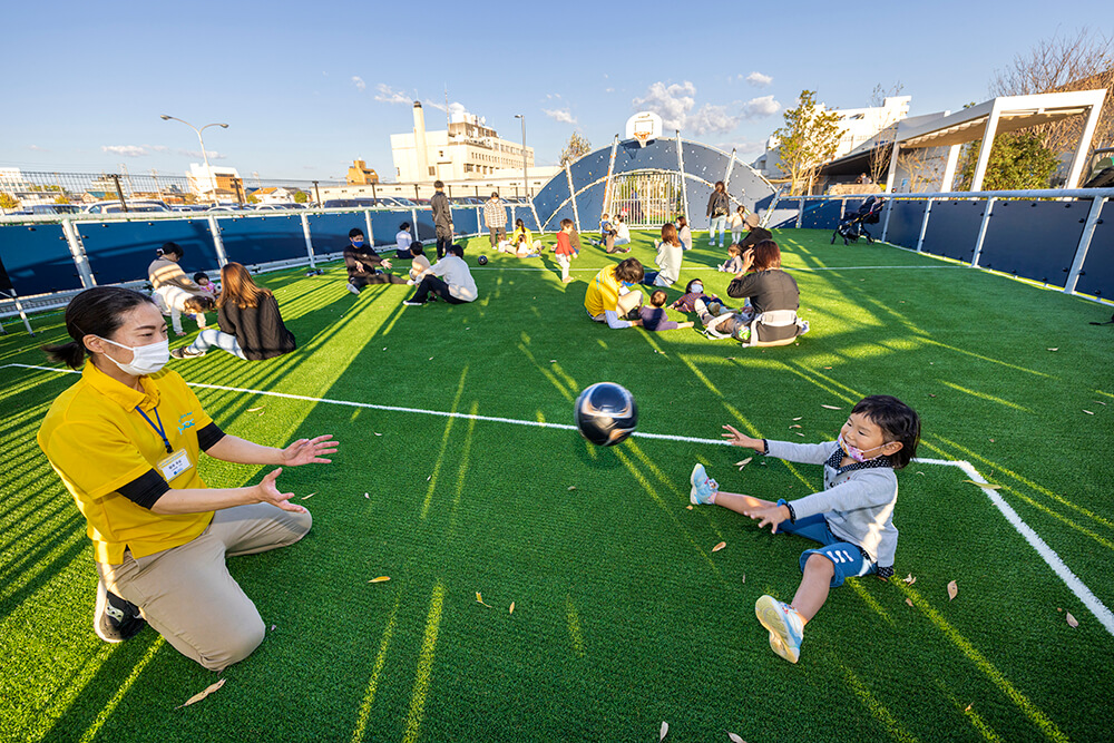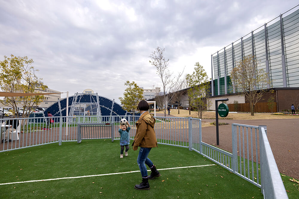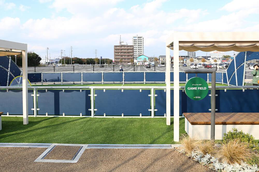 ミニフットサルやバスケットボールのゴールがあり、いつでも誰でも球技が楽しめる、人工芝のゲームフィールド(12m × 20m)です。ボールはパークセンターで貸し出し(無料)を行っています。