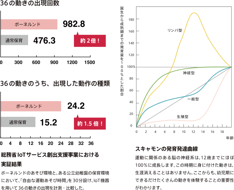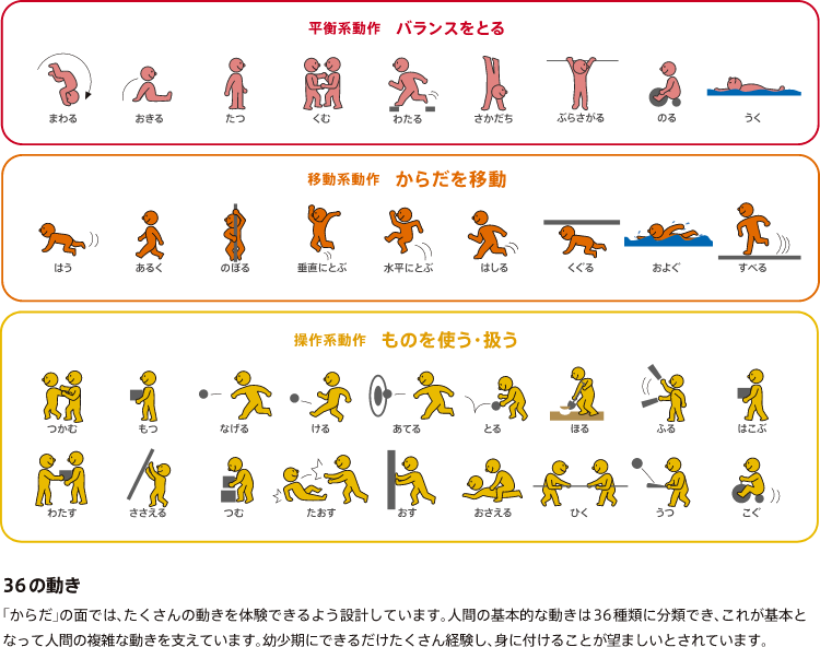 子どものこころと頭と身体の発達は、互いに密接に関係し合い、補完しあって進みます。 モーヴィは、その中でも最も根幹のからだあそびを中心に、年齢別に多種多様なあそびを揃えています。 身体を動かす中でも創意工夫して頭(認知能力)をつかい、他の子と一緒にとりくむ中でこころ(情緒・社会性)の発達も促します。