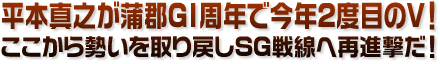 今回の蒲郡周年を制したことで、改めて地元の看板レーサーとしての存在感を示した平本であるが、11月の浜名湖GⅠ周年を最後にF休みに入る。SGチャレンジカップへの出場を逃し、賞金上積みも厳しい状況だが、今回の優勝をきっかけに勢いを取り戻し、再びSG戦線に名を連ねる姿を期待したい。